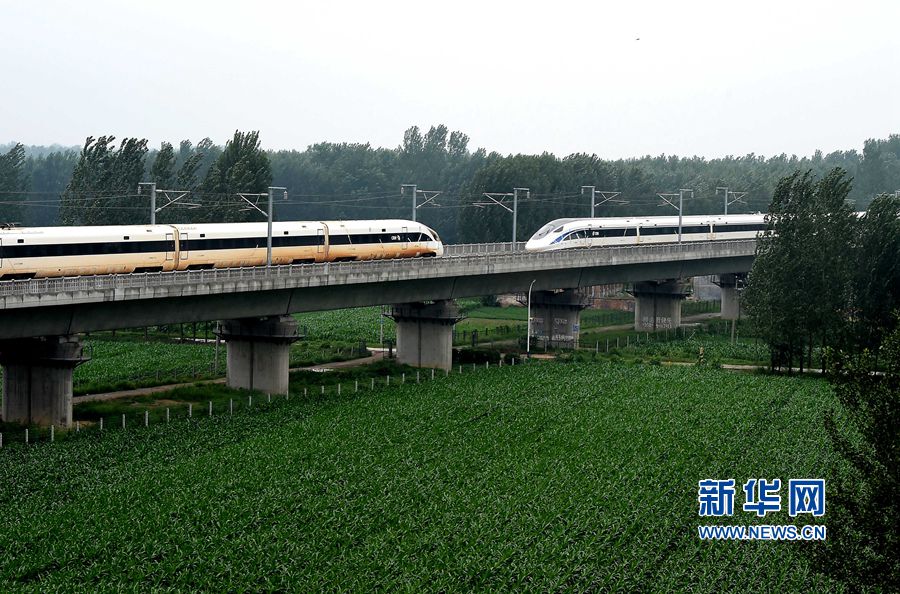 7月15日11時(shí)20分,兩列自主研制的中國標(biāo)準(zhǔn)動(dòng)車組“金鳳凰”(左)和“海豚藍(lán)”在鄭(州)徐(州)線上,分別以420公里的速度交會(huì)而行,這是世界最高速的動(dòng)車組交會(huì)試驗(yàn)。