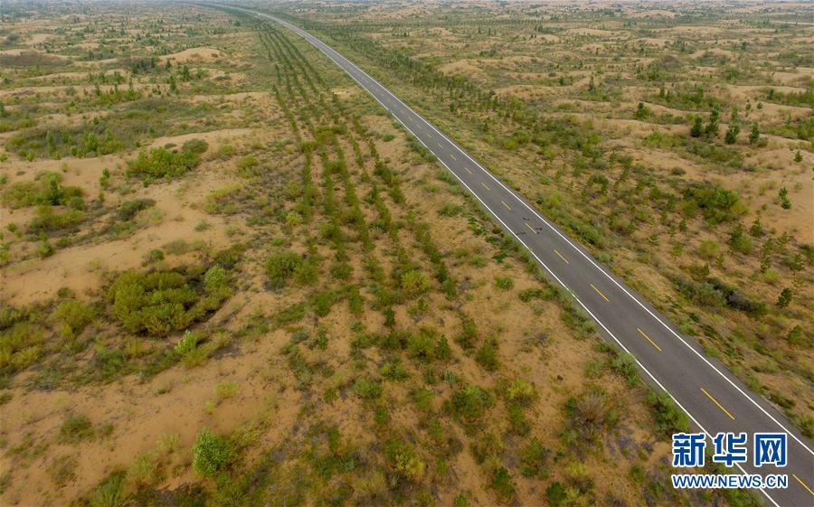•    內(nèi)蒙古庫布其沙漠的穿沙公路兩側(cè)綠意蔥蘢(9月4日攝)!