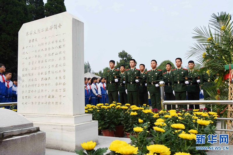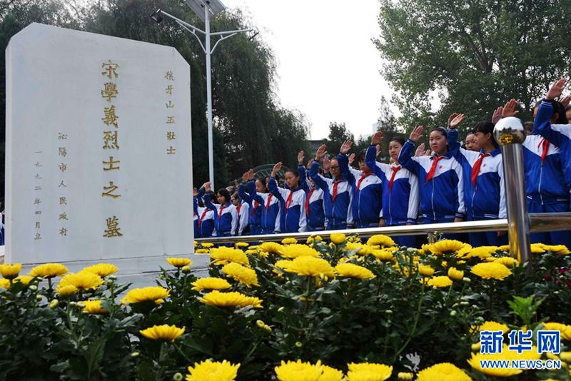 9月30日,在沁陽市烈士陵園,少先隊(duì)員正在瞻仰狼牙山壯士宋學(xué)義陵墓。當(dāng)日,是我國烈士紀(jì)念日。上午8點(diǎn)30分,沁陽市在烈士紀(jì)念碑前舉行大型烈士公祭活動(dòng)。來自該市的黨政機(jī)關(guān)干部、部隊(duì)官兵、烈士遺屬代表、少先隊(duì)員、青年學(xué)生、社會(huì)各界代表等1500余人參加公祭活動(dòng)。新華網(wǎng)發(fā)(楊志強(qiáng) 攝) -