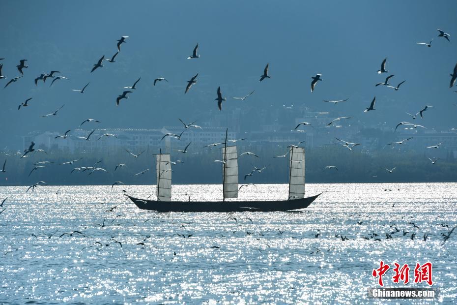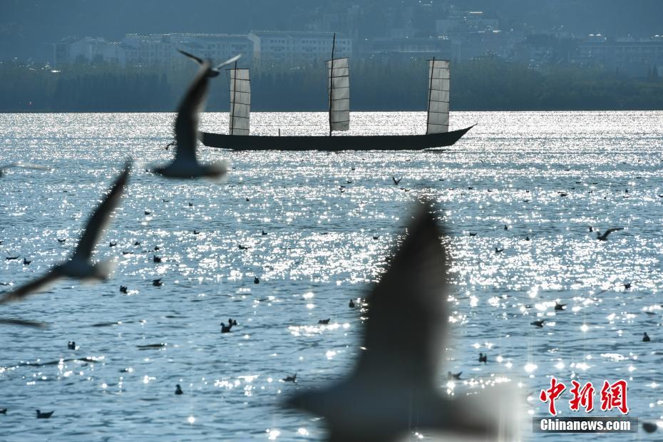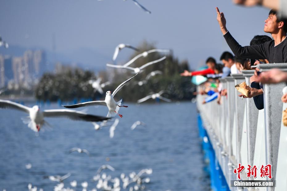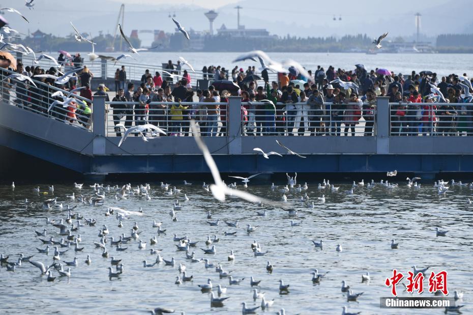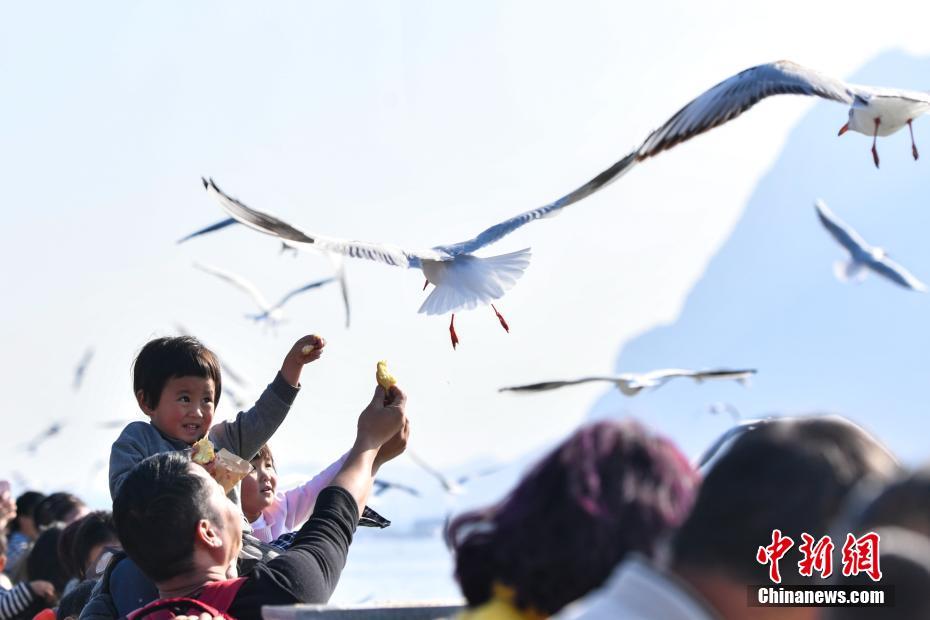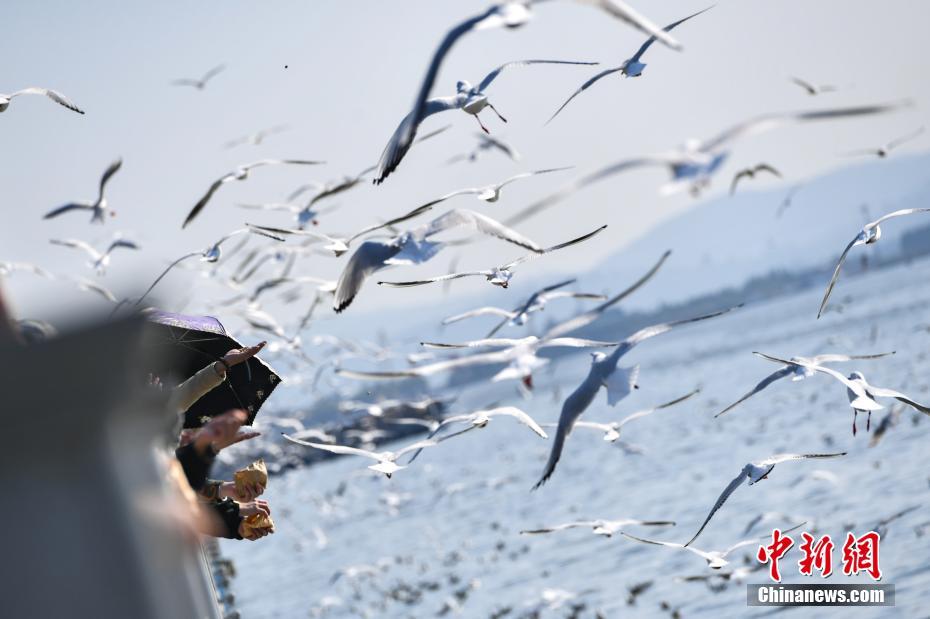 萬只紅嘴鷗飛抵昆明滇池 游客與鷗同樂