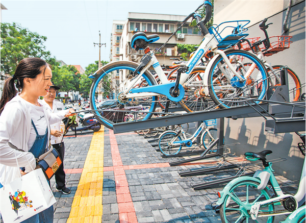 7月9日,一雙層共享單車立體“停車器”亮相鄭州市中原區(qū)計(jì)劃路街頭,車架上整齊擺放著一排排共享單車,引來不少行人好奇的目光。