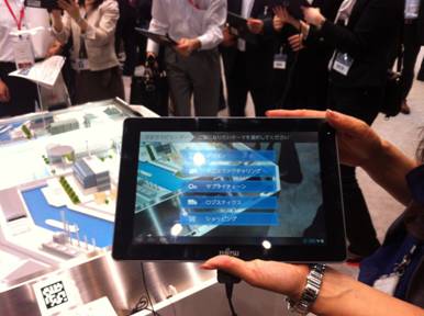 富士通東京國際論壇的展覽現(xiàn)場分為三大區(qū)域,近百個展位,展示包括產(chǎn)品、應(yīng)用、解決方案在內(nèi)的全方位ICT技術(shù)及應(yīng)用。展館入口的主題舞臺(圖1)處,屏幕上的山本正巳社長為參觀者講述富士通堅(jiān)持以人為本的創(chuàng)新理念。主題舞臺后方,首先是 “社會創(chuàng)新”展示區(qū),該區(qū)域展示了富士通在交通、醫(yī)療、農(nóng)業(yè)、教育、能源等社會基礎(chǔ)設(shè)施領(lǐng)域的最新技術(shù)成果和應(yīng)用案例。通過詳細(xì)豐富的事例,參觀者可以直觀感受到未來可持續(xù)發(fā)展的社會形態(tài),親身體驗(yàn)ICT技術(shù)力量在商業(yè)和社會變革中的推動作用。 隨后是 “業(yè)務(wù)創(chuàng)新”展示區(qū),這里展示的是ICT技術(shù)活用所帶來的商業(yè)業(yè)務(wù)模式變革,比如人們關(guān)心的大數(shù)據(jù)運(yùn)用、制造業(yè)革新、營銷模式改變、、工作模式變革等。展覽的最后一個區(qū)域名為“支持創(chuàng)新的ICT技術(shù)”,這一區(qū)域展示了富士通最引以為傲的尖端技術(shù)、包括云服務(wù)、安全與業(yè)務(wù)連續(xù)性解決方案、高可靠高性能的基礎(chǔ)架構(gòu)平臺等產(chǎn)品和服務(wù)。