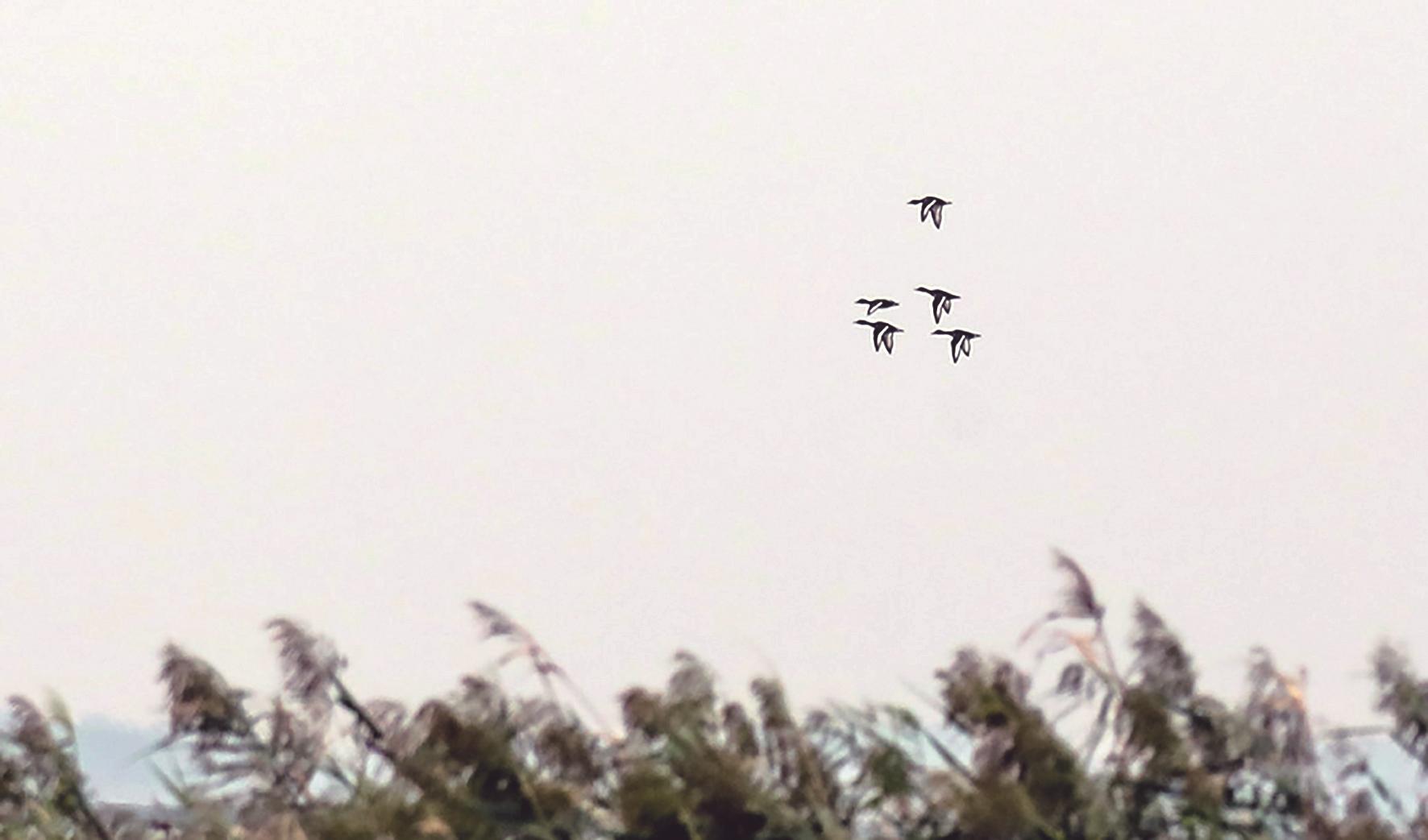 17日上午9時(shí)許,武漢市觀鳥協(xié)會(huì)副會(huì)長(zhǎng)姚波帶領(lǐng)11名調(diào)查人員對(duì)蔡甸沉湖國(guó)際重要濕地進(jìn)行生物多樣性調(diào)查。當(dāng)時(shí)一片幾個(gè)足球場(chǎng)大的水塘上,100多只綠頭鴨和1000多只羅紋鴨已如期遷徙至此,唯有兩只青頭潛鴨在一旁單獨(dú)活動(dòng);另外,距此水塘2公里左右的荷塘里,又發(fā)現(xiàn)兩只青頭潛鴨,大家精神振奮。之后,姚波從一張抓拍的鳥兒空中飛行照片中驚喜地發(fā)現(xiàn),自由飛翔的5只鴨,原來也是青頭潛鴨。