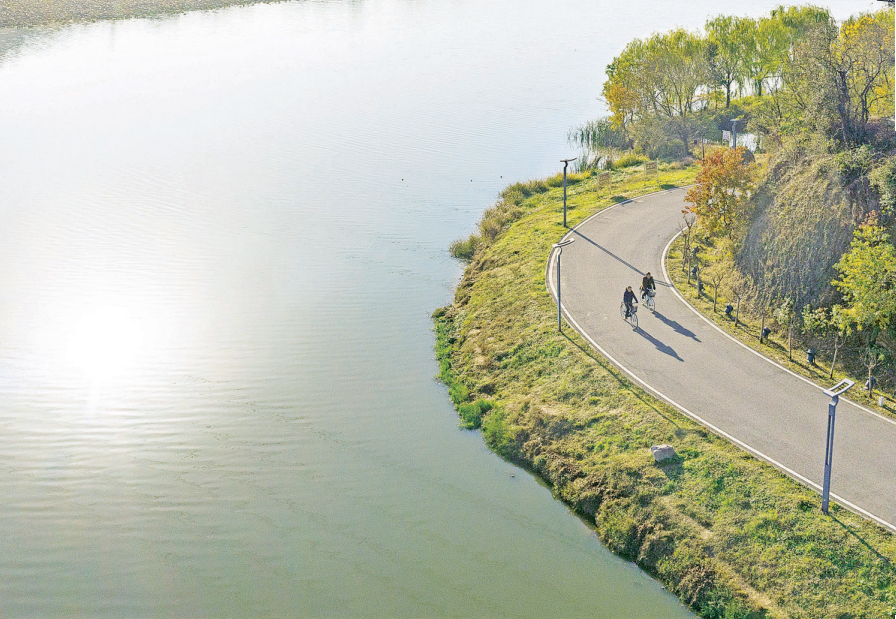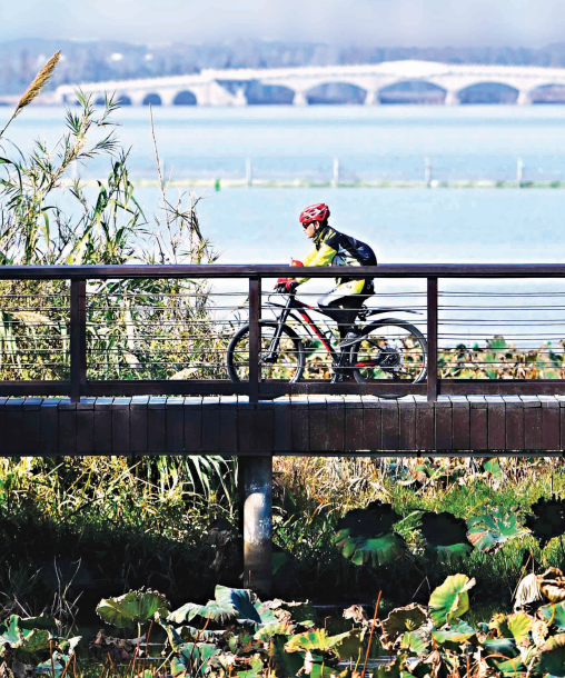 市民騎行在風(fēng)景秀麗的東湖國家濕地公園。長江日報記者高勇 攝