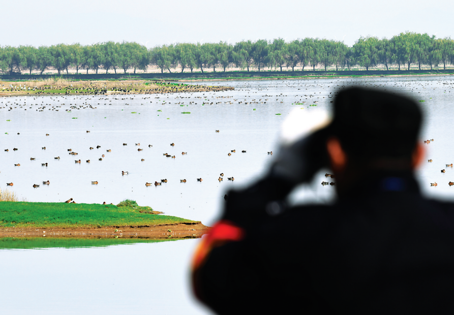 在府河濕地,候鳥保護(hù)志愿者正在觀察候鳥越冬情況。長江日報記者金振強(qiáng) 攝