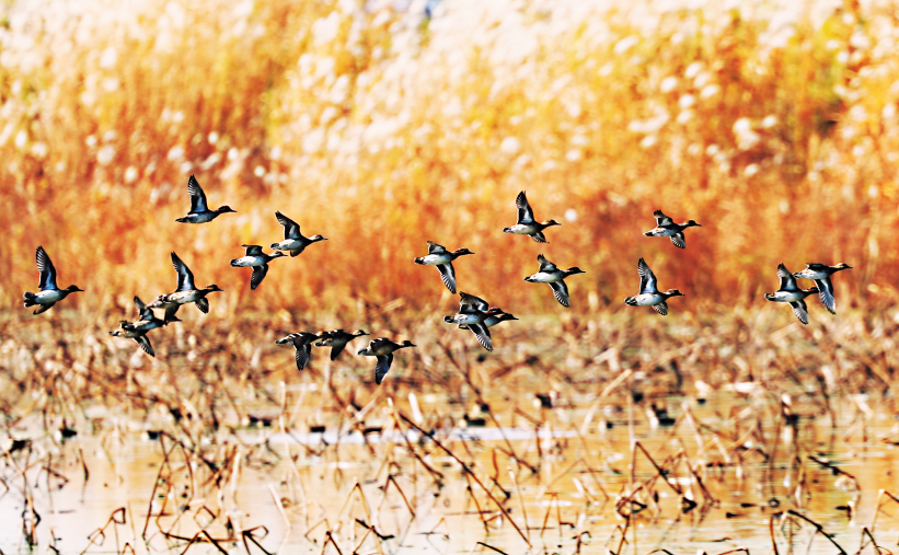 上涉湖省級濕地自然保護(hù)區(qū)內(nèi),綠翅鴨在蘆葦蕩上飛翔。長江日報記者何曉剛 攝