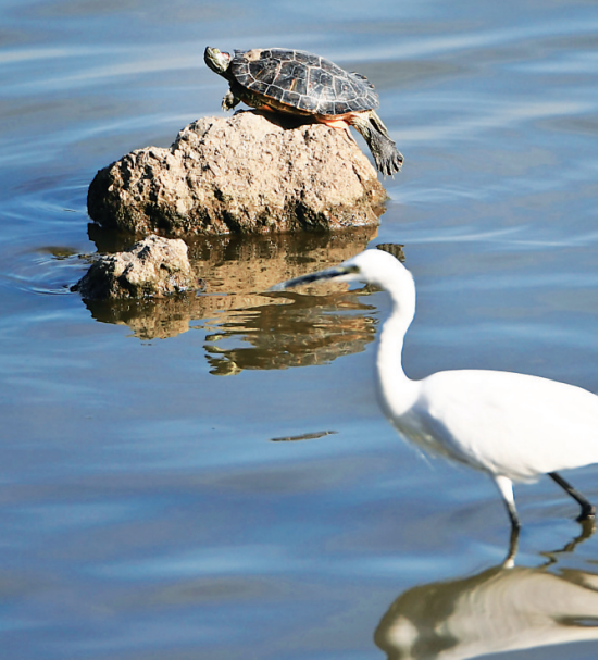 東湖國家濕地公園,動物們在湖中悠閑地覓食、曬太陽。長江日報記者高勇 攝