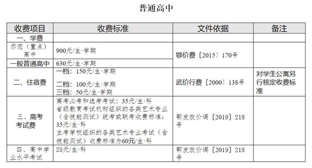 武漢市普通高中收費項目,包括學費、住宿費、高考考試費。其中,示范(重點)高中每學期學費900元/生,一般普通高中630元/生。住宿費分3檔:150元/生、100元/生、50元/生,學生公寓另行核定收費標準。