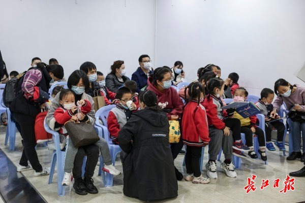 11日,武漢市金銀潭醫(yī)院新冠疫苗臨時接種點(diǎn),一所幼兒園組織家長帶小朋友集體接種疫苗。 記者胡冬冬 攝