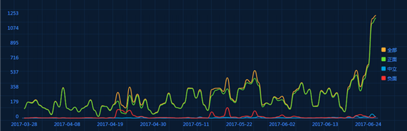 值得一提的是,荊楚網(wǎng)絡(luò)大數(shù)據(jù)輿情中心監(jiān)測(cè)發(fā)現(xiàn),今年湖北黨代會(huì)的預(yù)熱期長(zhǎng)達(dá)約半年之久,早在2016年12月,已經(jīng)有不少與黨代會(huì)相關(guān)的信息出現(xiàn),在2017年1月的湖北省兩會(huì)期間,更是出現(xiàn)了一個(gè)輿論高峰期。而最近3個(gè)月,黨代會(huì)的相關(guān)報(bào)告也一直居高不下,各界對(duì)黨代會(huì)的關(guān)注度一直保持在一個(gè)較高的水準(zhǔn)。6月25日,黨代會(huì)的召開(kāi)將輿論情緒推向頂峰,并且還在不斷上升之中。