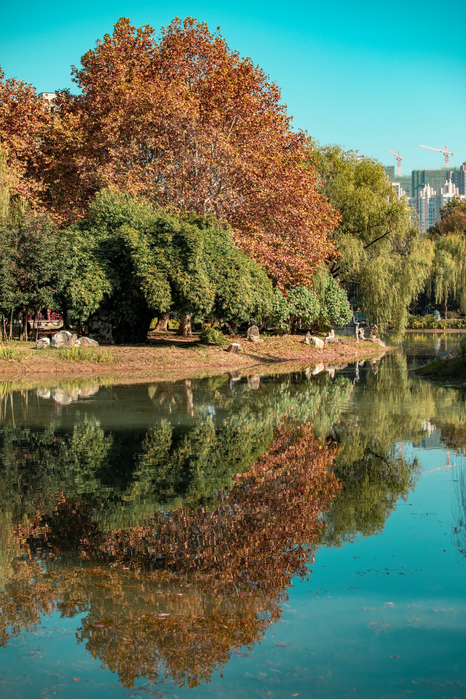 堤角公園“前身”為種苗場(chǎng),本無湖。為打造出“江南水鄉(xiāng)”景致,開挖了一個(gè)人工湖。湖畔種了排排柳樹。挖出來的淤泥,則在湖邊形成小圍坡,依水成景。