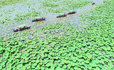 十里荷花長(zhǎng)廊上游人泛舟 圖片來源:長(zhǎng)江日?qǐng)?bào) 記者陳亮 攝