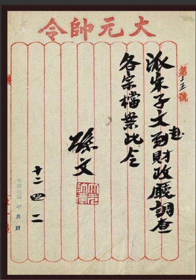 香港普藝拍賣行副主席莊志崗介紹說,這五封令文歷史價(jià)值極高,當(dāng)中以兩封“大元帥令”最為珍貴,用以委任,其中一封便寫道:“任命宋子文為中央銀行副行長”。