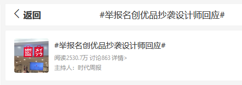 隨后,名創(chuàng)優(yōu)品被設計師舉報抄襲的消息迅速發(fā)酵,相關(guān)話題登上微博熱榜單。兩天內(nèi),#名創(chuàng)優(yōu)品被設計師舉報抄襲#的話題閱讀量超2.3億。當日下午,名創(chuàng)優(yōu)品客服表示,已經(jīng)報備相關(guān)部門進行核查。