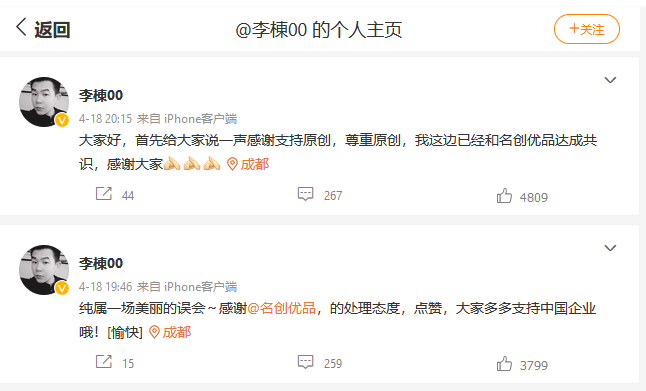 然而,很快,“戲劇化”的一幕出現(xiàn)了。18日晚間,設計師@李棟00 改口了。該名設計師連發(fā)兩條微博回應稱,“純屬一場美麗的誤會”,還為名創(chuàng)優(yōu)品點贊,表示已和名創(chuàng)優(yōu)品達成共識,并在接受媒體采訪時表示,將與名創(chuàng)優(yōu)品合作1-3年。