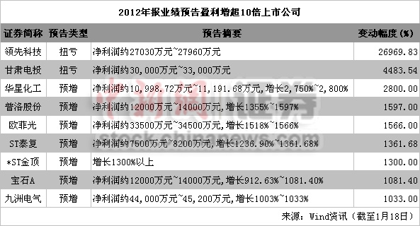 業(yè)績(jī)報(bào)喜公司中,領(lǐng)先科技、甘肅電投、華星化工、普洛股份、歐菲光、ST泰復(fù)、*ST金頂、寶石A、九洲電氣業(yè)績(jī)盈利增超10倍。其中,業(yè)績(jī)扭虧的領(lǐng)先科技和甘肅電投預(yù)計(jì)業(yè)績(jī)最高增長(zhǎng)269倍和44倍居前兩位。