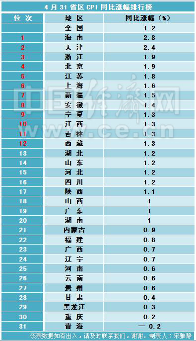 中國(guó)經(jīng)濟(jì)網(wǎng)記者匯總4月31省區(qū)的CPI漲幅情況, 4月全國(guó)CPI同比上漲1.2%,其中12省區(qū)CPI同比漲幅超全國(guó)水平。由漲幅高低排序,依次為海南、天津、浙江、北京、江蘇、上海、新疆、安徽、寧夏、江西、吉林、西藏。