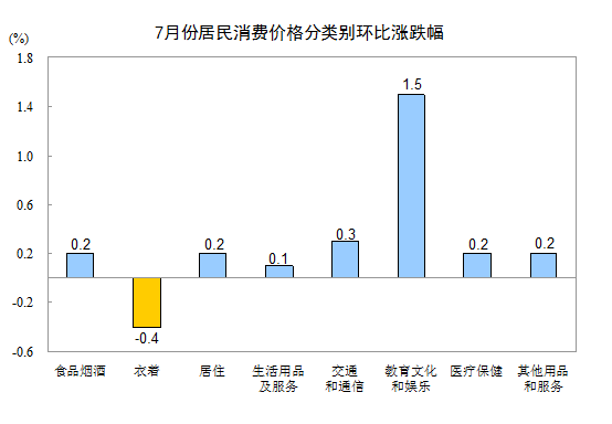 7月份,全國居民消費(fèi)價格環(huán)比上漲0.3%。其中,城市上漲0.4%,農(nóng)村上漲0.1%;食品價格上漲0.1%,非食品價格上漲0.3%;消費(fèi)品價格上漲0.1%,服務(wù)價格上漲0.7%。