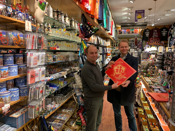 荷蘭阿姆斯特丹一家紀(jì)念品店內(nèi)老板展示“!弊滞扑]中國(guó)游客“掃!。