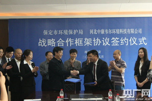 保定市環(huán)保局局長肖寶元(左)、中康韋爾總經(jīng)理陳龍(右)分別代表雙方在戰(zhàn)略合作框架協(xié)議書上簽字并為“智能環(huán)保聯(lián)合實驗室”揭牌。