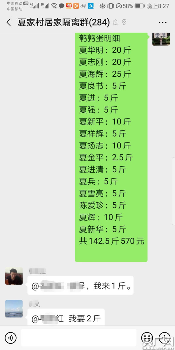 頓時(shí),同田鄉(xiāng)的婦聯(lián)工作群、機(jī)關(guān)干部工作群、疫情信息閉環(huán)工作群等近10個(gè)微信群里熱鬧了起來:“可以送貨上門嗎?行的話來20斤!薄拔乙褰铩、“我食堂里要60斤”....隨著一條條信息推出,下單的也接連不斷,聽說是貧困戶家的鵪鶉蛋積壓,不少干部在自己的朋友圈也轉(zhuǎn)發(fā)起來。夏家村的居家隔離群更是接起了長(zhǎng)龍,短短一個(gè)小時(shí),就有20多戶村民訂購(gòu)了近150斤鵪鶉蛋。在大家的幫助下,通過微信群、朋友圈以及村民自發(fā)訂購(gòu)等方式,僅15號(hào)一天就下單售出鵪鶉蛋500多斤,這下可把吳華樂壞了,皺著的眉頭也打開了。他說:這次多虧了扶貧干部,解了他的燃眉之急,他堅(jiān)信,有黨和政府的關(guān)心和依靠,他一定能發(fā)家致富。吳華還表示,疫情發(fā)生后,鎮(zhèn) 村干部和志愿者都忙碌防疫一線,他也要申請(qǐng)去當(dāng)志愿者蛋,為防控疫情盡一力。