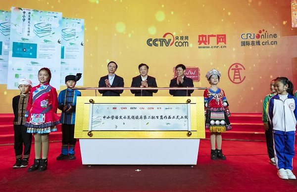 2018年12月23日下午,中央廣播電視總臺、教育部、國家語委聯(lián)合舉辦“中小學語文示范誦讀庫”第二季作品發(fā)布會。中宣部副部長、中央廣播電視總臺臺長慎海雄,教育部副部長、國家語委主任杜占元,中央廣播電視總臺副臺長閻曉明出席發(fā)布會,并共同見證第二批100篇音頻教材正式上線發(fā)布。 新華社記者沈伯韓 攝
