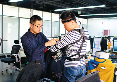 劉建(左一)在與同事做動作捕捉調(diào)試。