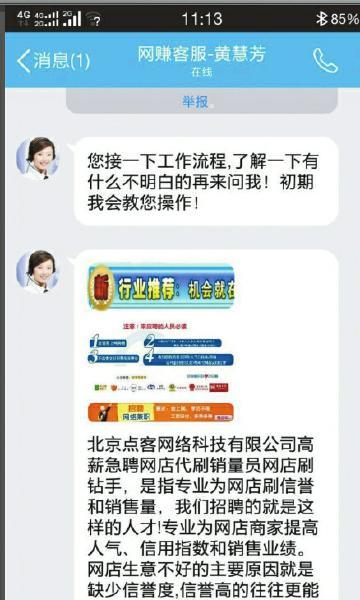 一天前,陳先生登錄58同城網(wǎng)站,向4家公司發(fā)出了兼職意向。當天中午,他收到了一份面試邀請的短信,按照提示,添加了客服黃慧芳的QQ號后,一個女性話務員的頭像彈出,穿著白襯衣,扎起馬尾,顯得精神抖擻。第一句話便是讓“了解工作流程”,接著,客服發(fā)來一段幾百字的說明。