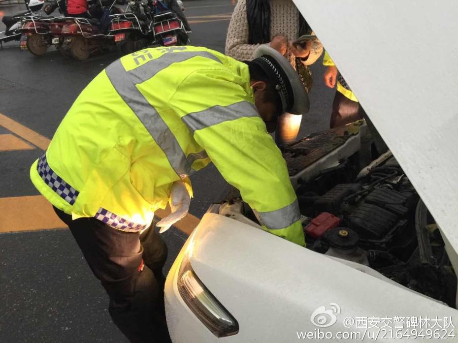 近日,一輛小轎車停到西安南門內(nèi)盤道,司機(jī)說一路上聽見車?yán)锖孟裼胸埖慕新暋?圖片來源:西安市公安局交通警察支隊(duì)碑林大隊(duì)官方微博)