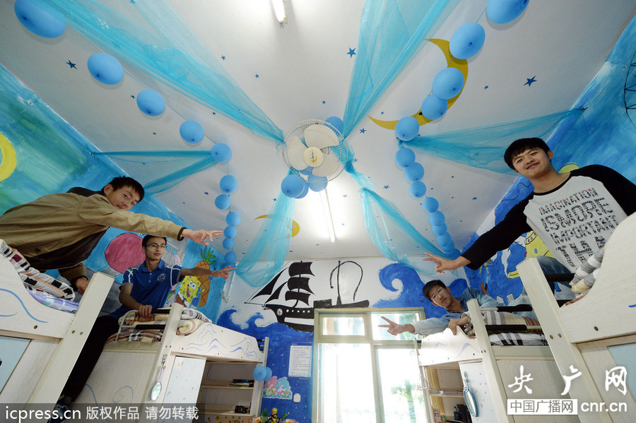 2013年10月26日,重慶西南大學(xué)學(xué)生會舉辦了一場新生宿舍美化大賽,數(shù)以千計的新生參與。許多創(chuàng)意獨特的95后,花了不到200元,就把寢室裝出了高端洋氣上檔次的格調(diào)?ㄍㄙu萌、奇幻漂流、文藝范兒……來看看他們的宿舍風(fēng)格與背后的故事吧。可愛卡通墻每人有萌名宿舍:經(jīng)濟(jì)管理學(xué)院工商管理專業(yè)大一男生宿舍竹園C棟316室花費:不超過100元,主要花費在顏料紙張上畫著卡通小黃人的墻、維尼熊馬克杯、小螞蟻粉T恤……若不是墻角散落著的幾只略有味道的球鞋,你很難將眼前這間宿舍與男生聯(lián)系在一起。這間宿舍萌至如此,必須歸功一個人:宿舍的賣萌小王子詹鑫豪。自打入校的第一天起,發(fā)嗲、買各類賣萌產(chǎn)品……詹同學(xué)盡顯賣萌本色。在他的影響下,宿舍其他5個哥們也發(fā)現(xiàn)了自己的賣萌天分,集體賣萌成了宿舍的風(fēng)氣。比如:大家集體購買了一系列風(fēng)格迥異的卡通睡衣,包括奶牛版、熊貓版等;再比如,大家有了一個個超萌的外號:大狼、肥羊、猴子、毛毛、嚶。在寢室美化設(shè)計時,詹鑫豪出力不少。“我們計劃在墻上畫點東西,但別的東西都好難畫,我突然想到近期看的動畫片《卑鄙的我》里的小黃人,不是正好又萌又簡單嗎?”全宿舍一致認(rèn)可這個提案,詹鑫豪更主動承擔(dān)起為小黃人上色的任務(wù)。自稱“不擅賣萌”的周密同學(xué)表示,“相比很多同齡人,我們宿舍顯得比較幼稚。但用萌這種方式記錄生活,算是青春記憶吧!弊霞喪酵挷璧纴硐喟樗奚幔和鈬Z學(xué)院免師英語專業(yè)大一7班女生宿舍桃園1棟201室花費:不超過200元,主要用于買卡通畫和紫紗擁有一個童話古堡,是萬千少女的夢想,英語班的幾位同學(xué)把它變成了現(xiàn)實。最初,室長吳倩一提議走公主風(fēng),立馬獲得壓倒性的支持。此后給宿舍起名字、設(shè)計細(xì)節(jié)等,遇到意見不一致時,都是以少數(shù)服從多數(shù)為原則,“但有一點:不能放馬后炮!备髯砸鹿裆系木S尼熊、米老鼠,搭在蚊帳上的層層紫色紗布,甚至在廁所門前專門貼了一張公主畫……公主風(fēng)鋪天蓋地而來。這間宿舍在全院打響名號,除了夢幻的布置,還離不開室友袁凡的宣傳。宿舍里兩套精致的茶幾頗引人注目,它們的主人、被同學(xué)們盛贊為“茶神”的妹子來自云南,家鄉(xiāng)盛產(chǎn)普洱茶,“我們家很多人是茶文化愛好者。我平時泡了茶,就會喊大家來喝,享受泡茶、品茶的過程。”時光軸愛上照片墻宿舍:經(jīng)濟(jì)管理學(xué)院農(nóng)業(yè)經(jīng)濟(jì)管理大一1班女生宿舍南苑9舍525室花費:不超過200元,錢主要用在購買顏料、卡紙等上愛拍照、愛旅游、愛泡咖啡館……在王麗君看來,宿舍姐妹們雖然性格有靜有動,但或多或少都有顆文藝的心。這也很好地解釋了為什么舍長宋錦雯一提議宿舍美化走文藝范,大家都舉雙手贊成。“不如和人人網(wǎng)一樣,我們也建一個實體版的時光軸”、“不如我們貼上黃色的墻紙,讓宿舍看起來像個咖啡館”……確立主題后,舍友們你一言我一語開始構(gòu)思細(xì)節(jié)。很快,時光軸火速出爐,事后它確實成為了宿舍的一大標(biāo)志。時光軸的主材料是涼席和各張打印出來的照片以及文字解說。時光軸上,記錄了大家相處的兩個多月美好時光。王麗君向記者介紹,“第一張是軍訓(xùn)開始前在宿舍的第一張合影,第二張是軍訓(xùn)拉練時我們疲憊狀態(tài)下的自拍,第三張是班級第一次聚餐,我們宿舍的坐在一起……”談起“時光軸”的未來,王麗君表示,“我們都是自拍狂,也特別喜歡記錄生活的點點滴滴,所以未來肯定會有更多精彩照片,我們還會分享出來,當(dāng)然那時我們可以選擺更美的照片!