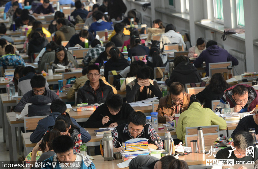 2013年10月29日,山西太原,目前2014年考研報(bào)名即將收官,備戰(zhàn)考研的大學(xué)生們進(jìn)入了最后的沖刺階段。記者利用近一周的時(shí)間,進(jìn)入山西大學(xué)、太原理工大學(xué)、山西醫(yī)科大學(xué)等高校,晝夜跟拍備戰(zhàn)考研的“學(xué)霸”們,用鏡頭記錄下他們考研路上的苦樂日子。自習(xí)室、圖書館、走廊、宿舍……在大學(xué)校園里,隨處都能看到考研的學(xué)生在埋頭苦讀的身影,他們懷揣著研究生夢(mèng)想,準(zhǔn)備抓住考前兩個(gè)月的時(shí)間“血拼”一把。