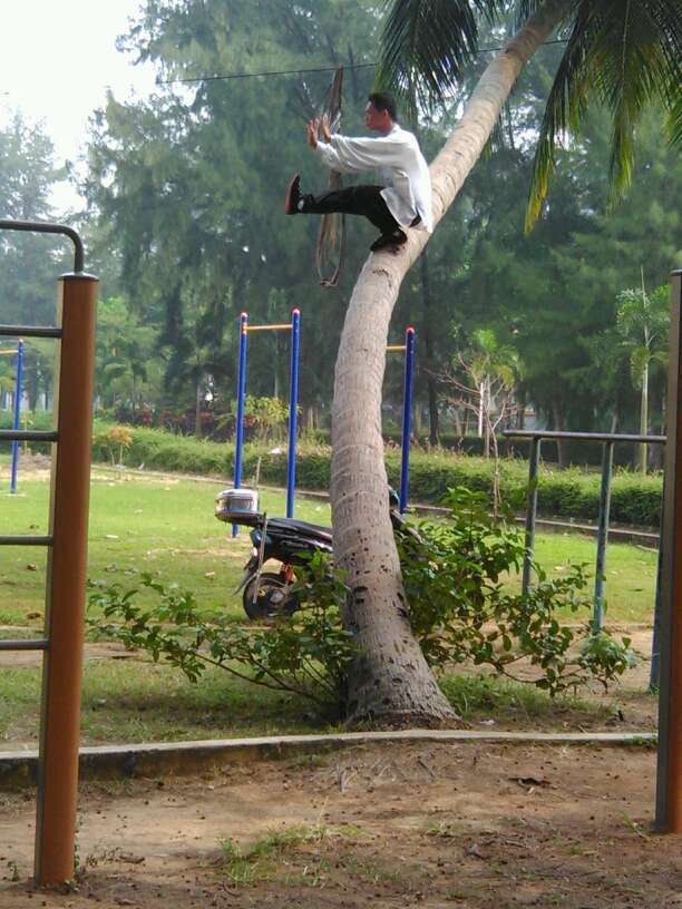 “海南大學(xué)內(nèi)驚現(xiàn)神人,椰子樹上練功!苯眨@樣一則圖片內(nèi)容在網(wǎng)上火了。從照片看,練功者為一白衣男子,其先在草地上練功,隨后鏡頭轉(zhuǎn)到距離地面有四五米高的椰子樹上,白衣男子在樹上練功,時而金雞獨(dú)立,時而單腿蹲坐,一招一式鎮(zhèn)定自若,頗有大家風(fēng)范。