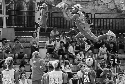 端午小長(zhǎng)假期間,在歡樂(lè)谷籃球廣場(chǎng)舉行的室外籃球表演賽,讓游客們大飽眼福。本報(bào)記者 戴冰攝