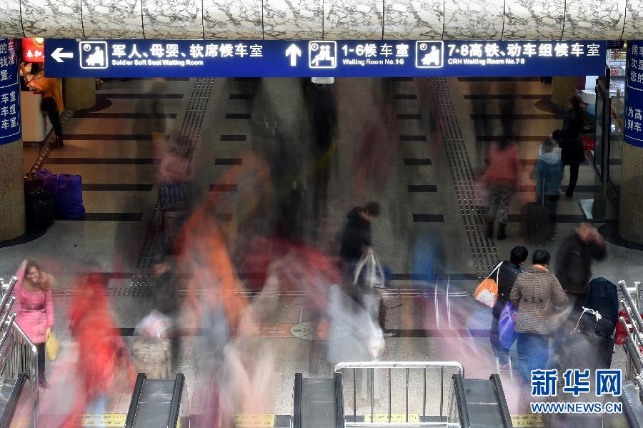 2月11日,旅客們?cè)卩嵵莼疖囌緶?zhǔn)備進(jìn)站上車。記者從交通部門獲悉,2015年春運(yùn)自4日開啟以來已到一周,截至10日,全國(guó)道路運(yùn)輸旅客突破4.2億人次,鐵路約4600萬人次,全國(guó)公路、鐵路、民航、水運(yùn)運(yùn)輸安全平穩(wěn)有序。