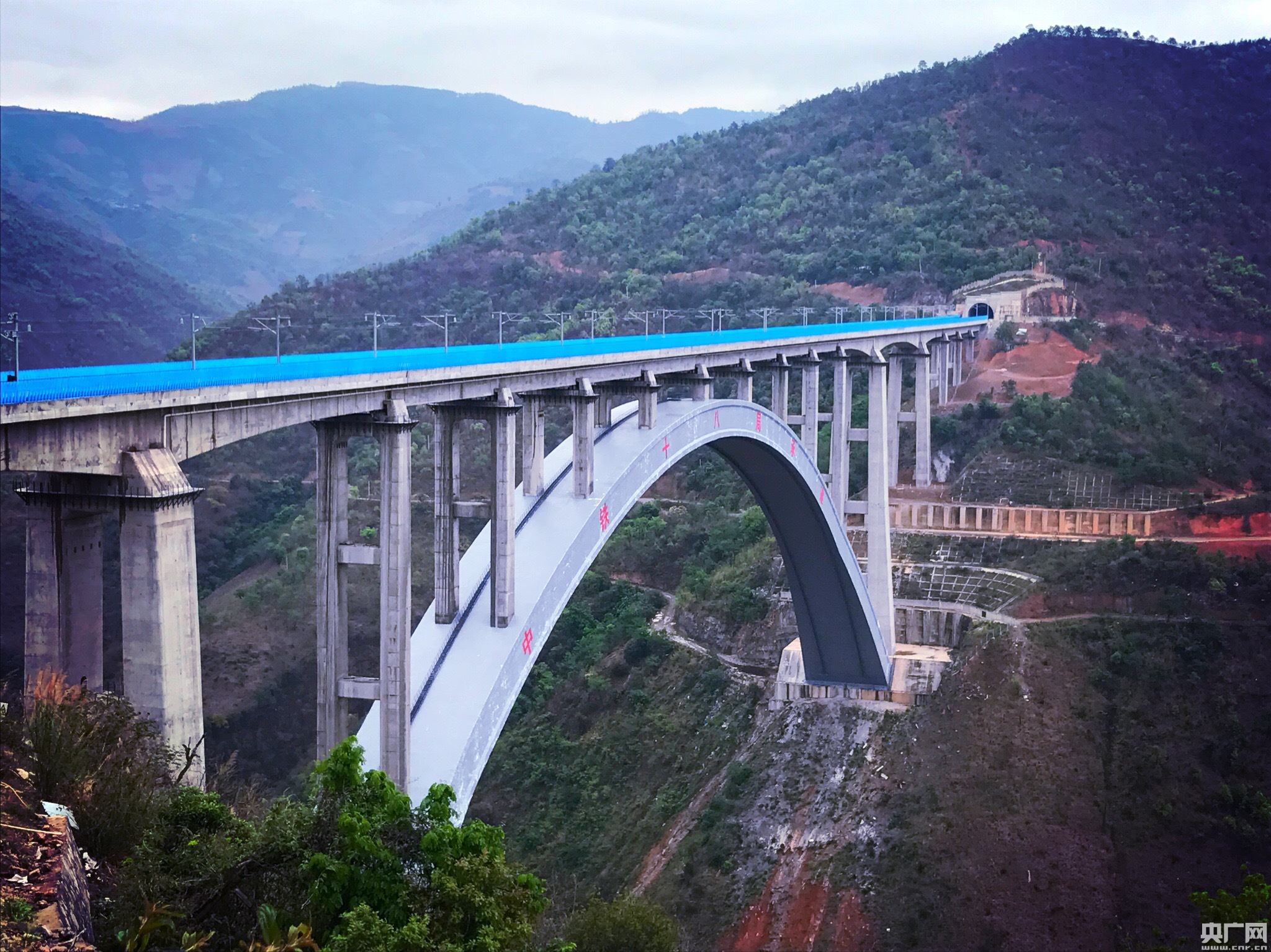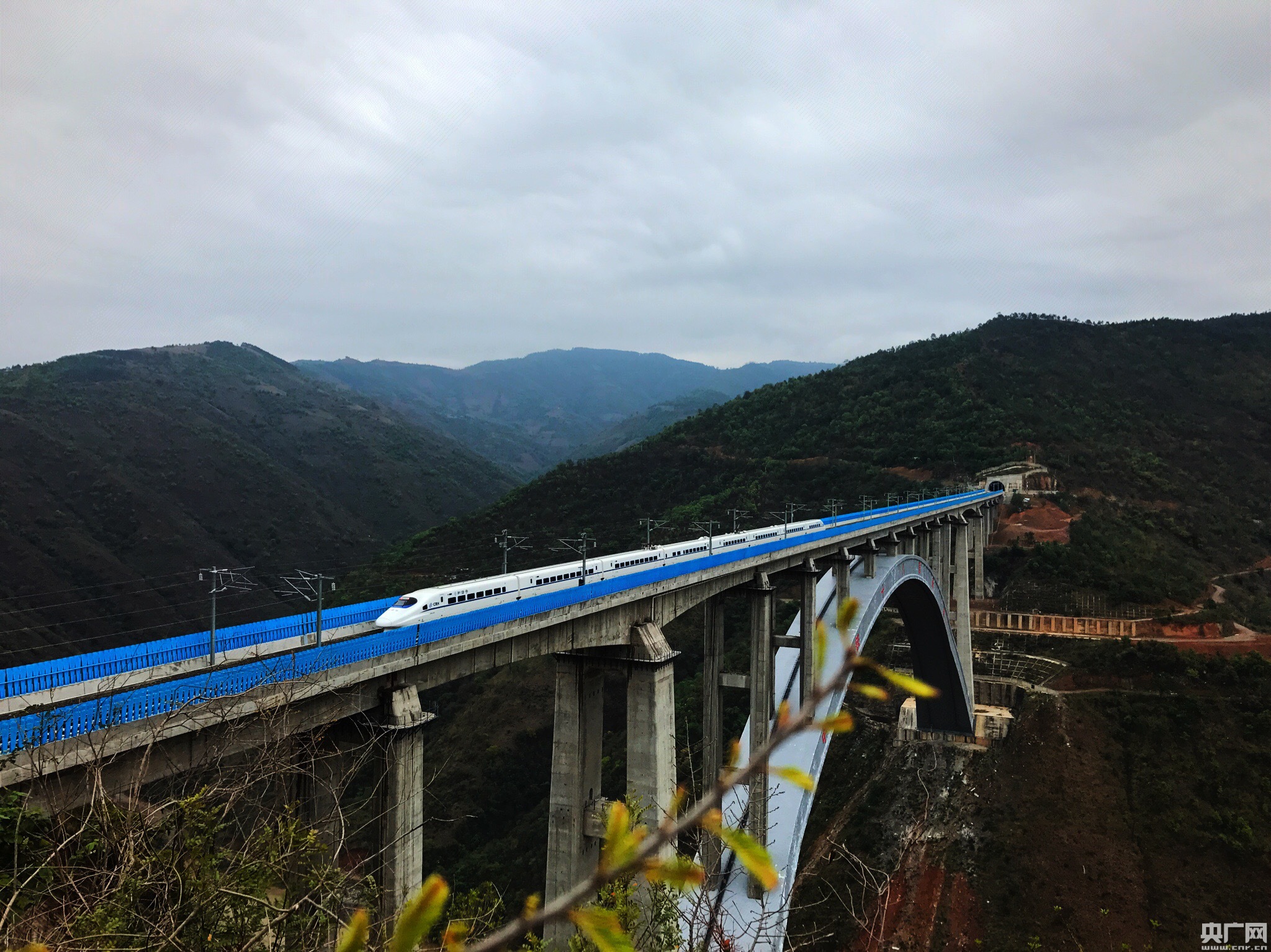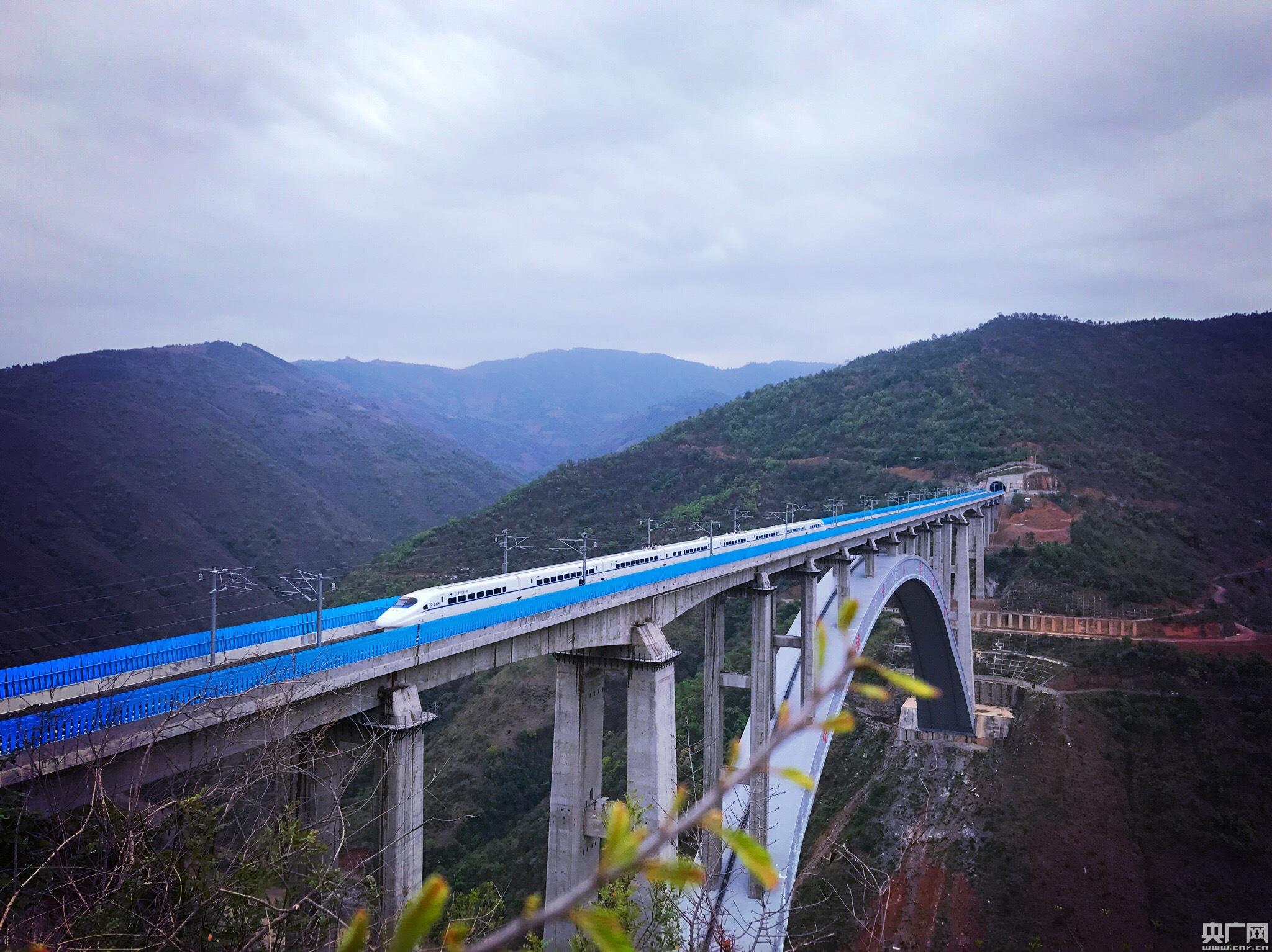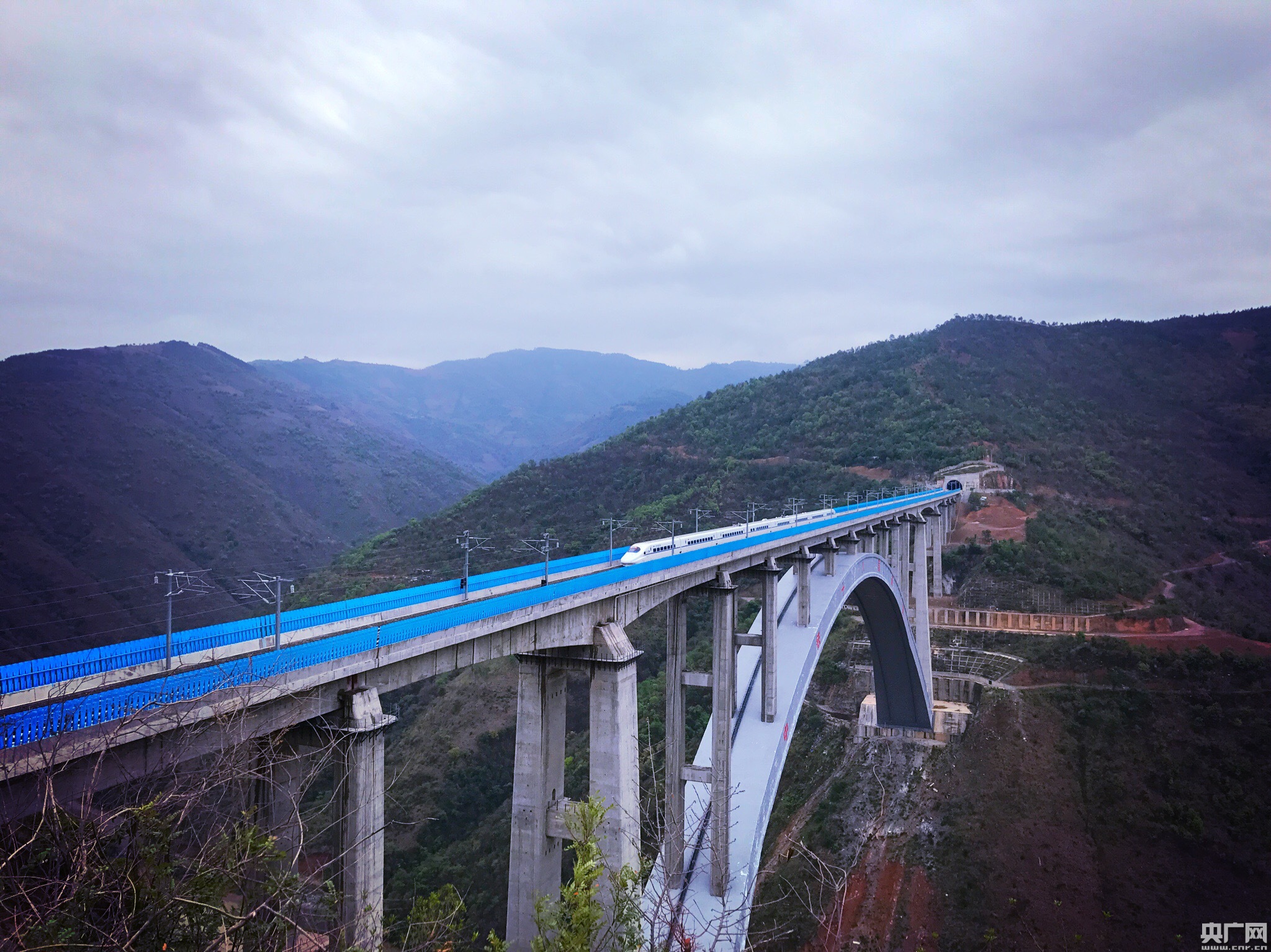 2017年4月23日,紅河,動車組列車在云桂鐵路南盤江特大橋上飛馳。 央廣網(wǎng)紅河4月23日消息(記者何微)近日,由中國鐵路總公司組織的“發(fā)現(xiàn)最美鐵路”系列活動在滇、桂舉行,本期主題“夢想飛躍云桂間”。23日,活動走進云南省紅河哈尼族彝族自治州,探訪動車組列車在云桂鐵路上飛馳“云端”的絕美景色。 據(jù)悉,云桂鐵路全長710公里,橋隧總長500公里,設(shè)計車速200公里至250公里,2016年12月28日全線開通運營,從昆明到南寧的行車時間由原來的12個小時縮短為5個小時。成為促進廣西、云南多民族地區(qū)經(jīng)濟發(fā)展的一條致富路。 在紅河州彌勒市與文山州丘北縣交界處,赤色的南盤江水蜿蜒前行,江面上270米高空處,云桂鐵路南盤江特大橋凌空而立,宛如一道飛虹騰云而臥,動車組列車在橋上行駛猶如飛馳在“云端”。 南盤江特大橋,全長852米,是目前世界最大跨度客貨共用高速鐵路特大橋。橋面凌空高出江面270米,大橋兩岸都是懸崖,山勢陡峭,坡度近50度,地形地貌復雜,山體滑坡、泥石流經(jīng)常發(fā)生。 南盤江特大橋讓天塹變通途,列車伴隨著南盤江水在橋上飛馳,成為云嶺大地上一道靚麗的風景線。 -