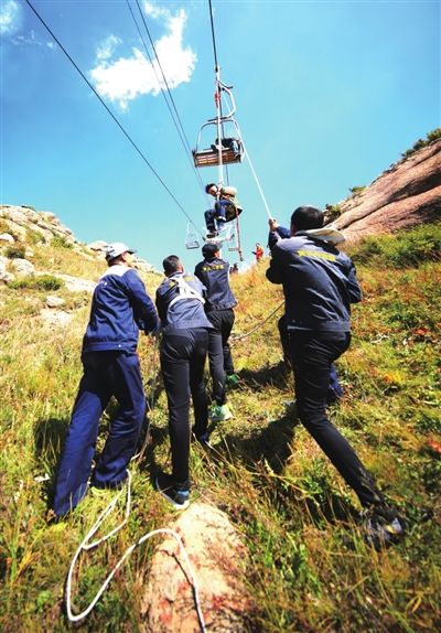 上午11時,應急救援演練正式開始。模擬故障為:由于突然停電,黃花溝1號索道停止運行,2名“游客”被困在10米多高的半空中,急需救援。面對突發(fā)事件,輝騰錫勒景區(qū)立即啟動索道應急救援預案,組織專業(yè)人員趕赴現場,對被困“游客”開展救援。到達現場后,索道操作人員一方面利用喊話器不間斷對“被困游客”進行喊話,安撫其情緒,防止“游客”因情緒失控發(fā)生墜落危險;另一方面,主救援人員通過救援器械小心并快速滑到游客所在的吊椅,將救生安全帶和緩降繩給“被困游客”系好,在地面工作人員的協(xié)助下,將“被困游客”安全降至地面。經過40多分鐘的緊張救援,兩名被困“游客”安全獲救,應急救援演練獲得圓滿成功。隨后,參加現場觀摩的質監(jiān)執(zhí)法人員與景區(qū)有關人員就演練情況交換了意見,同時要求景區(qū)運營方要充分落實安全主體責任,在不斷強化日常安全管理工作的同時,加強應急救援演練,防患于未然,確保設備安全運行。