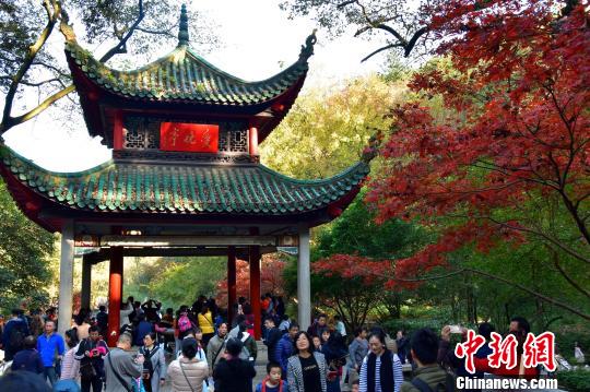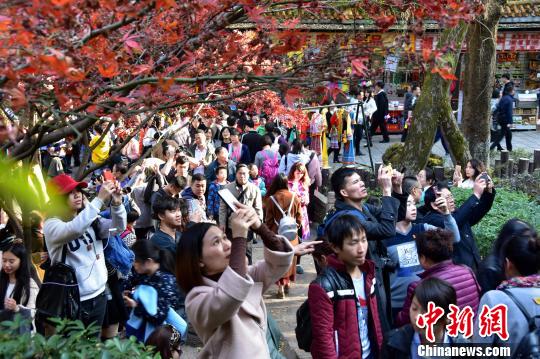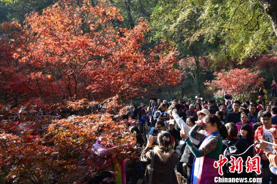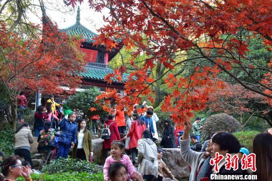 長沙岳麓山楓葉迎觀賞期 游客扎堆,長沙岳麓山楓葉進入最佳觀賞期。盧文偉 攝 楓樹林下聚集大批游客拍照留念。盧文偉 攝 11月26日,長沙岳麓山上迎來眾多游客扎堆賞楓。