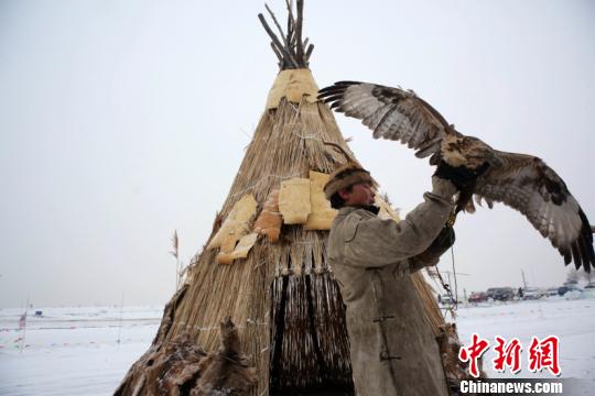 圖為冰釣節(jié)現(xiàn)場的達斡爾獵民和獵鷹 莫旗旅游局供圖