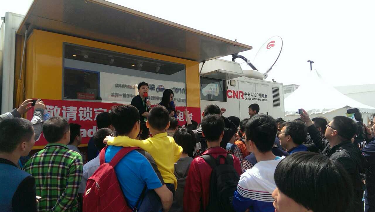 活動正式開始,石磊子桐前二十分鐘用廣播節(jié)目的狀態(tài)在都市之聲衛(wèi)星直播車里與聽眾進行了積極的互動,通過機智問答,并派送獎品的形式,讓聽眾觀眾情緒不斷高漲;顒舆M行二十分鐘后,兩位主持人在聽眾的歡呼聲中,走出了直播間來到聽眾中間。由于現(xiàn)場人多,受條件限制,站在后排的聽眾看不到兩位主持人的熱情聽眾竟然主動向鄰近站臺借來桌子讓石磊子桐站到桌上繼續(xù)進行活動,主持人子桐還適時推廣了都市之聲的其他節(jié)目和主持人,而石磊也演唱一首拿手歌,在聽眾的掌聲中,將《長安一路通》的聽眾見面會推向高潮。