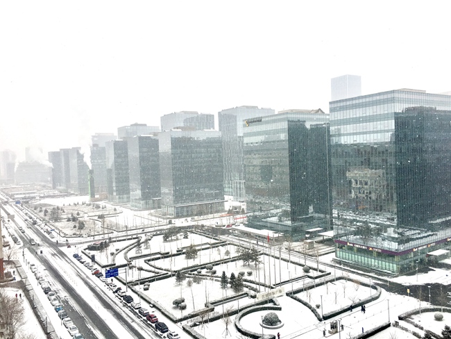 2月12日10時(shí),北京豐臺科技園路面開始積雪。(央廣網(wǎng)記者 陳銳海 攝)