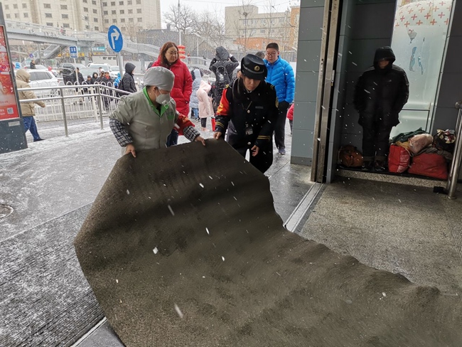 上午9點(diǎn),隨著降雪的增大,北京西站地區(qū)管理委員會(huì)啟動(dòng)了掃雪鏟冰應(yīng)急響應(yīng)。目前,地區(qū)物業(yè)管理部門和環(huán)衛(wèi)部門正對南北廣場和北下沉廣場積雪、路面積雪進(jìn)行清掃,并在車站門口鋪設(shè)防滑墊,保障旅客進(jìn)出安全。