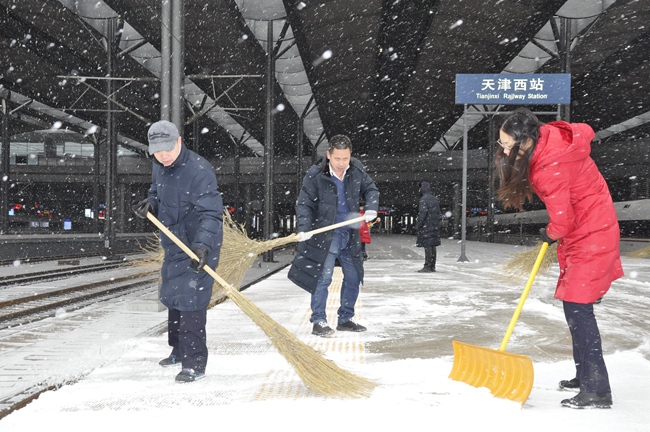 天津西站內(nèi),工作人員在清掃積雪。(北京鐵路局供圖)
