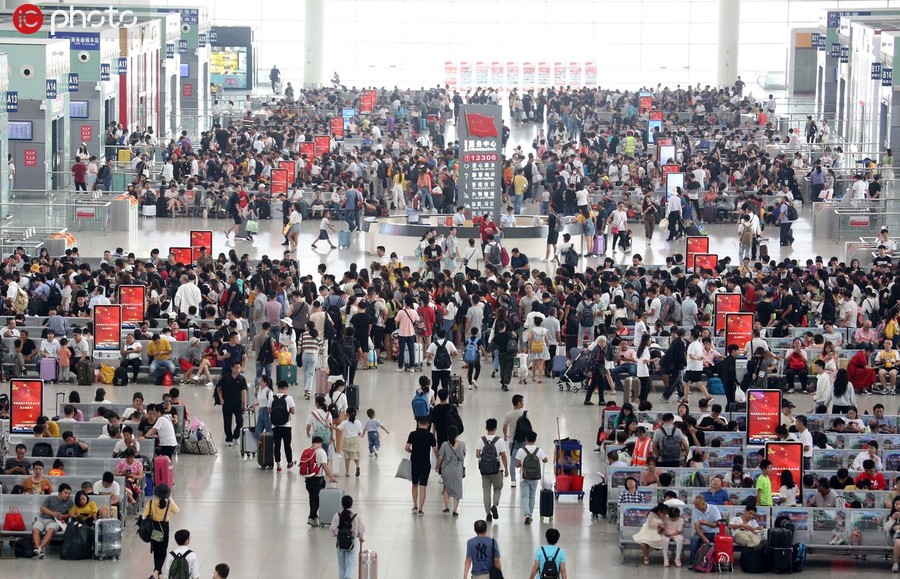 2019年10月5日,在江西南昌西車(chē)站,旅客正在候車(chē)。國(guó)慶假期過(guò)半,全國(guó)鐵路于當(dāng)日開(kāi)始出現(xiàn)返程客流高峰。(央廣網(wǎng)發(fā) 東方IC供圖)