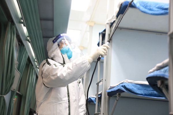 北京鐵路疾控中心小分隊(duì)正在對車廂進(jìn)行消毒(央廣網(wǎng)發(fā) 北京鐵路供圖)