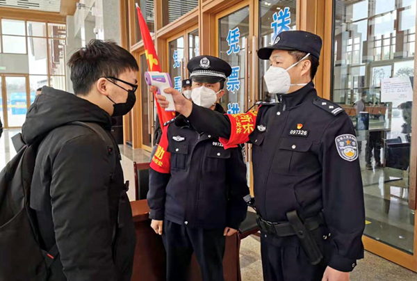 湖南懷化鐵路公安處民警為旅客測量體溫(公安部鐵路公安局供圖)