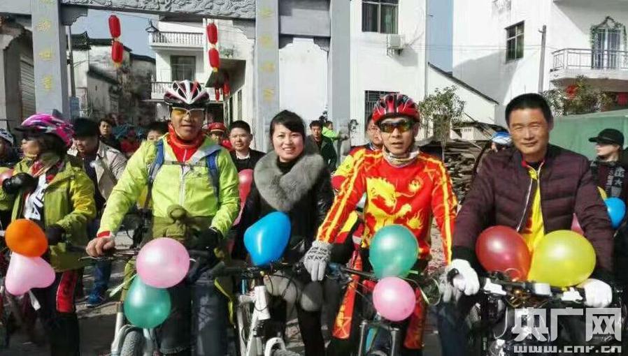 單車當(dāng)“寶馬” 幸福娶新娘(央廣網(wǎng)發(fā) 戴繼民 單長(zhǎng)華攝) 央廣網(wǎng)上饒2月8日消息(記者謝元森 通訊員戴繼民 單長(zhǎng)華)2月6日,一場(chǎng)浪漫環(huán)保的婚禮在江西省婺源縣賦春鎮(zhèn)舉行。新郎吳淦文別出心裁,沒有請(qǐng)豪華的迎親車隊(duì),而是讓幾十位車友騎著系有彩色汽球的單車組成迎親車隊(duì),接新娘吳小妹進(jìn)門。 -