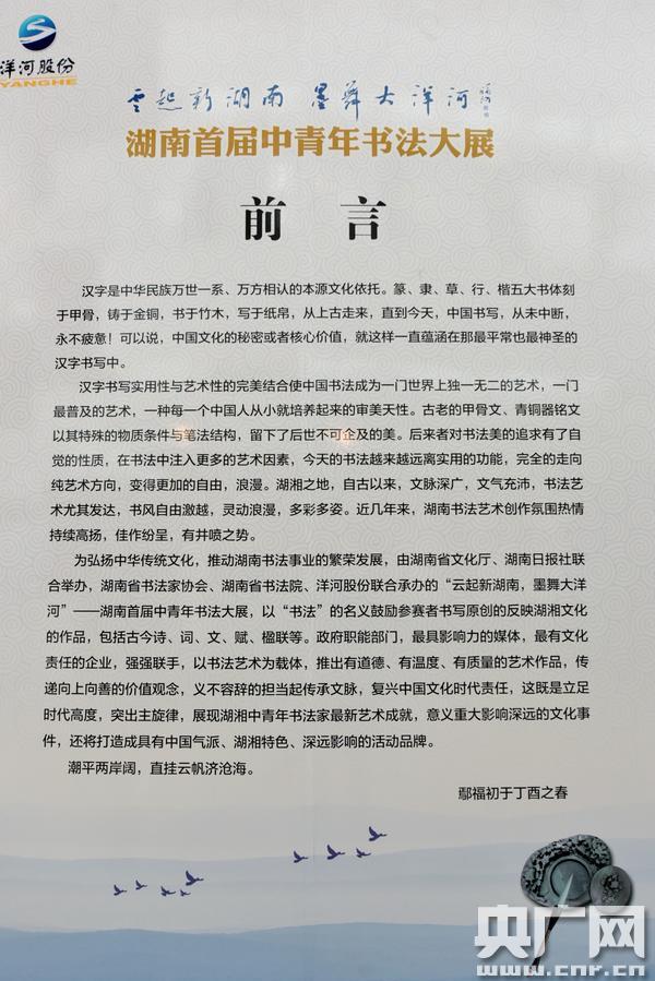 央廣網(wǎng)長沙4月28日消息(記者傅蕾 通訊員劉燦輝)4月28日,“云起新湖南 墨舞大洋河”---湖南首屆中青年書法大展開幕式在湖南省文化館舉行,并對28位優(yōu)秀作品的獲得者現(xiàn)場頒獎。自此,這場備受矚目和期待的書法展正式拉開帷幕。 -