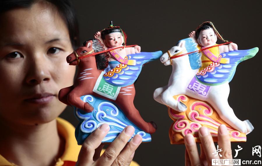 據(jù)介紹,這對由工藝美術大師喻湘蓮女士設計的名為“一馬當先福娃”泥塑作品,將民間傳統(tǒng)福娃的形象和馬的形象融合,色彩艷麗,神采奕奕,其中男孩騎赤兔寶馬,女孩騎白龍飛馬,福娃手抓韁繩,好比跨山河,穿云海,虎虎生風,疾馳而行,寓意策馬揚鞭,積極進取,力爭美好生活的精神面貌。