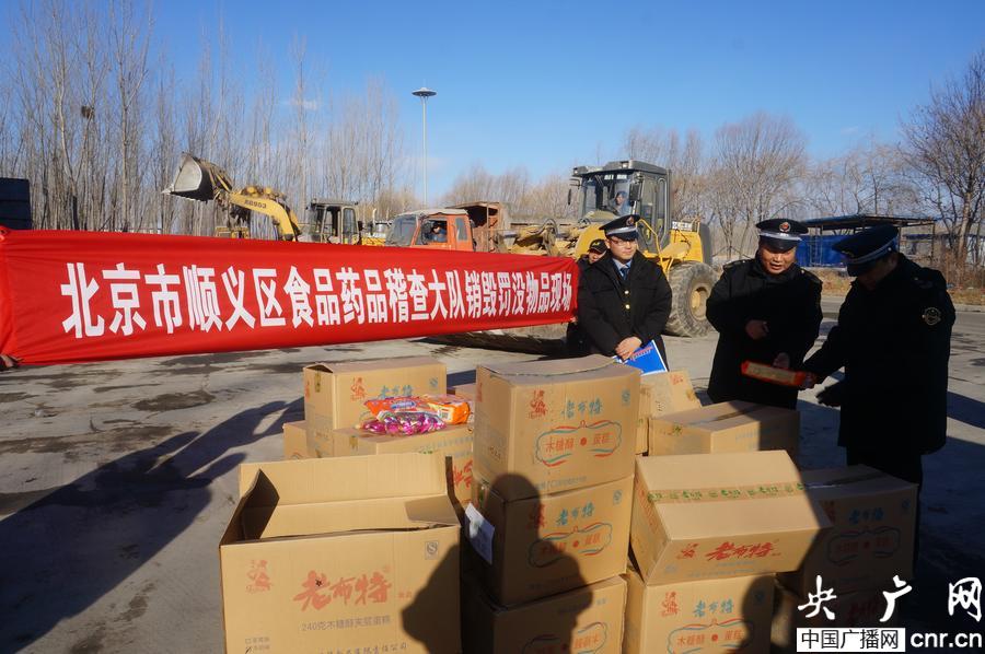 北京順義集中銷毀罰沒銷毀食品50箱(央廣網(wǎng)記者 李文蕊 攝)