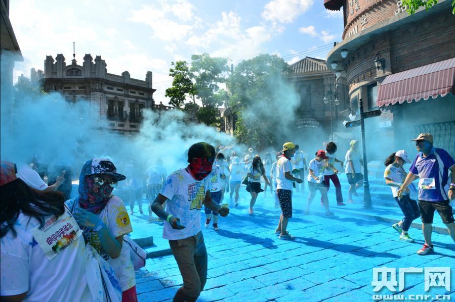 當天上午9點,在?谟^瀾湖華誼馮小剛電影公社影人星光大道路口正式開跑,同時在電影公社“1942街”鐘樓廣場、大型攝影棚拍攝區(qū)、觀瀾湖、蘭桂坊、?谑V湖、觀瀾湖火山巖礦溫泉500米龍脊長廊處都設(shè)有人工噴彩點,讓參與者除了跑出夏日激情,更能感受到觀瀾湖的魅力與活力。特別在電影公社“1942街”鐘樓廣場設(shè)有“藍色”人工噴彩,一條條長龍似的青年隊伍跑過狂噴的彩粉時,頓感頭頂上的藍天和地上變藍的青石板路已經(jīng)連成一線,傻傻分不清楚,美得掉渣。